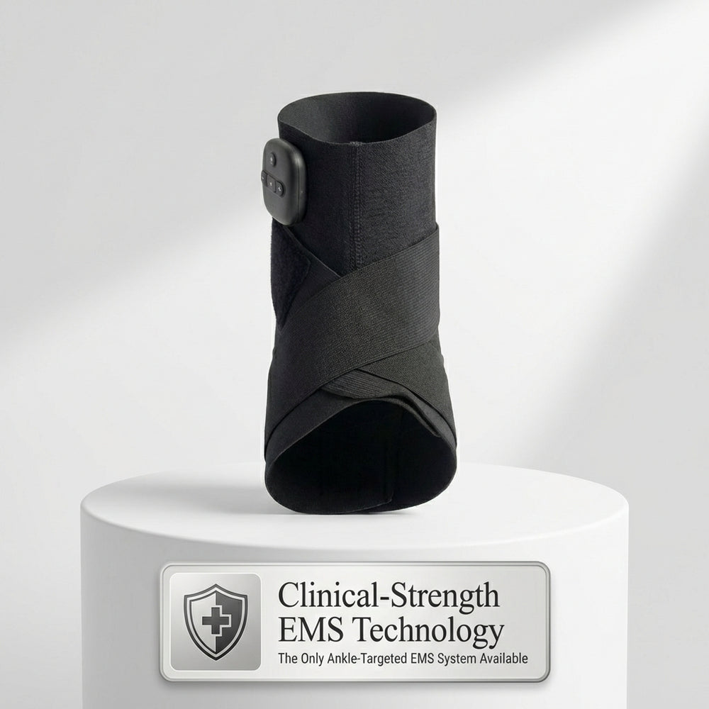Evuora uses professional-grade EMS technology positioned directly on your ankle joint. EMS sends electrical pulses that force your stabilizer muscles to contract involuntarily - rebuilding strength the same way physical therapy exercises would, except you're sitting safely in your chair. The continuous muscle contractions help you build strength while managing discomfort, so you'll actually use it consistently. 15 minutes daily while watching TV.